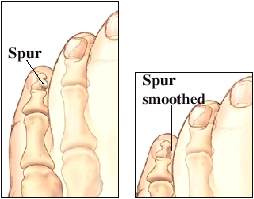These bony projections form as the body tries to repair itself. Bone spurs commonly occur on the heel and spine. Also had the big toe joint replaced. A tiny power rasp (similar to a dental burr) or a special file is inserted to smooth the bone.